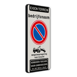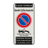 Verkeersbord eigen terrein - bedrijfsnaam - parkeerverbod + wegsleepregeling + verboden toegang