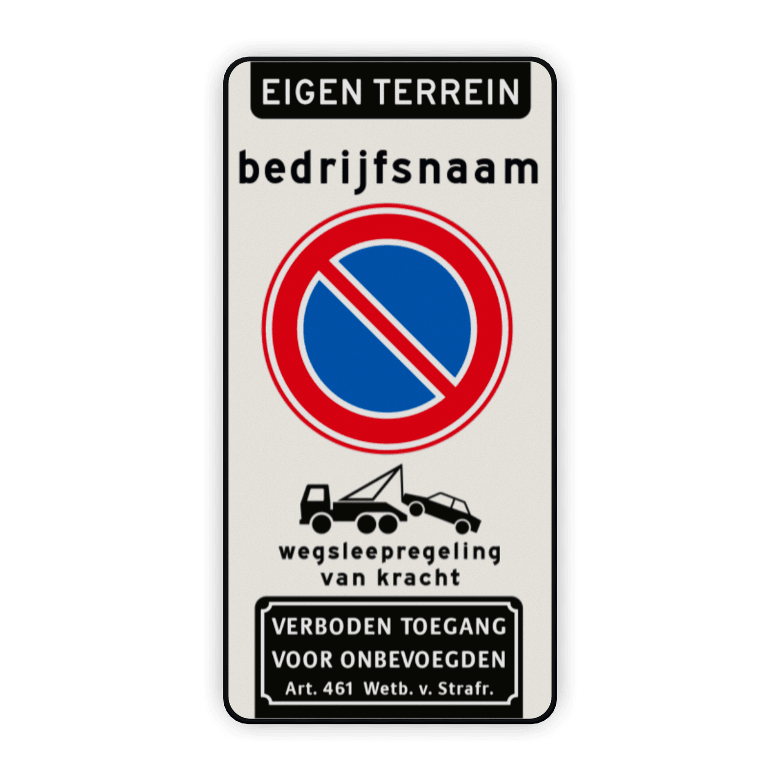 • Opdruk: Parkeerverbod, verboden toegang, wegsleepregeling en ruimte voor bedrijfsnaam